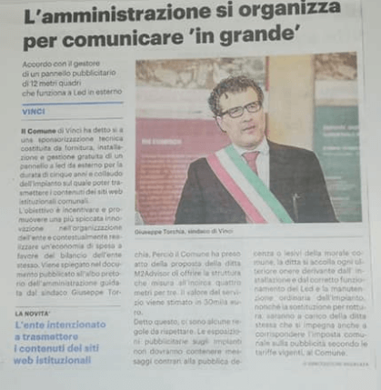 Comune di Vinci ha detto si a una sponsorizzazione tecnica costruita da fornitore, installazione e gestione gratuita di un pannello a led da esterno per la durata di cinque anni a collaudo dell’impianto sul quale poter trasmettere i contenuti istituzionali dei siti web comunali.
